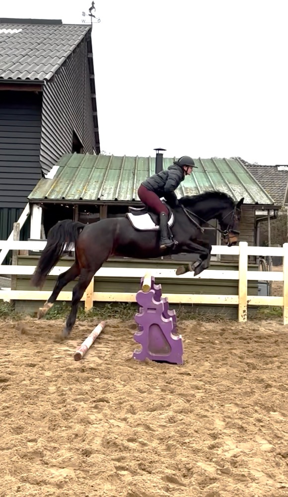 Hij is waanzinnig makkelijk in de aanleuning en geeft vanzelf na, is van nature heerlijk voorwaarts. Met het springen kijkt hij nergens van op en gaat altijd.