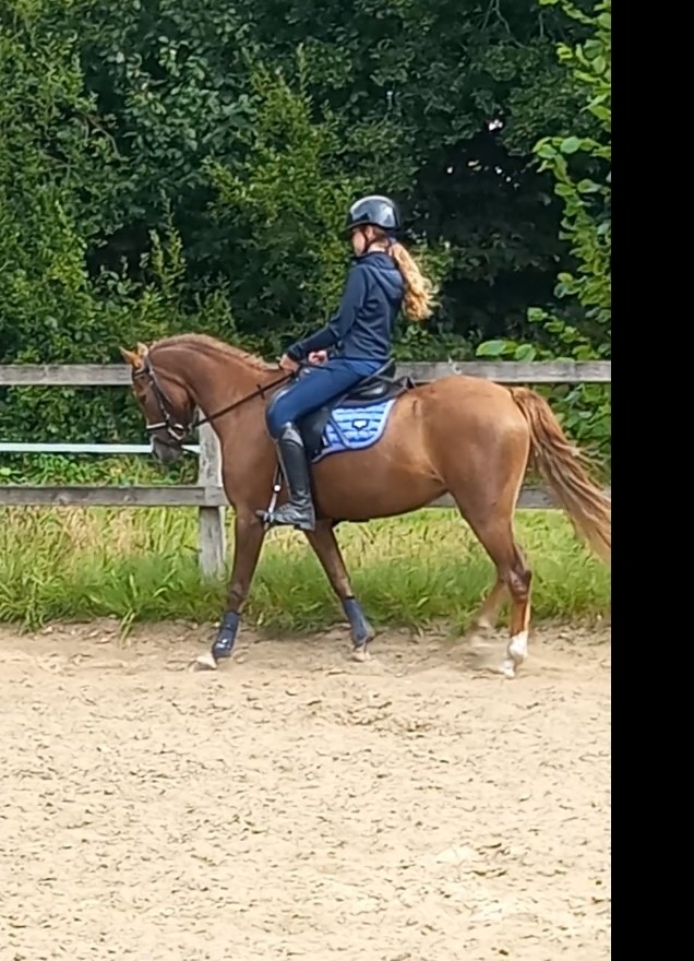 Springt met gemak 80 cm. Dressuur bezig met wissel en wijken.