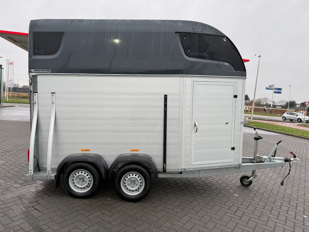 De Sirius S45 heeft aluminium zijwanden en een aluminium/compound vloer en wordt standaard geleverd met een klep/ deur-combinatie wat bijvoorbeeld ideaal is bij het in laten stappen van een jong paard of eventueel bij het laden met een heftruck. Dit is momenteel één van de ruimste 1,5 paardentrailers die verkrijgbaar is.